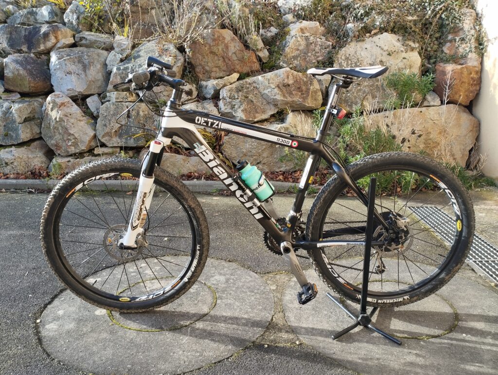 Le Bianchi Oetzi 9300 2012 est un hardtail randonnée haut de gamme en carbone monocoque, équipé Shimano LX 9v et fourche Marzocchi Marathon 100mm. Léger à 11.5kg environ, il offre confort et performance pour longues sorties trail. État bon, idéal pour relancer à prix marché attractif.